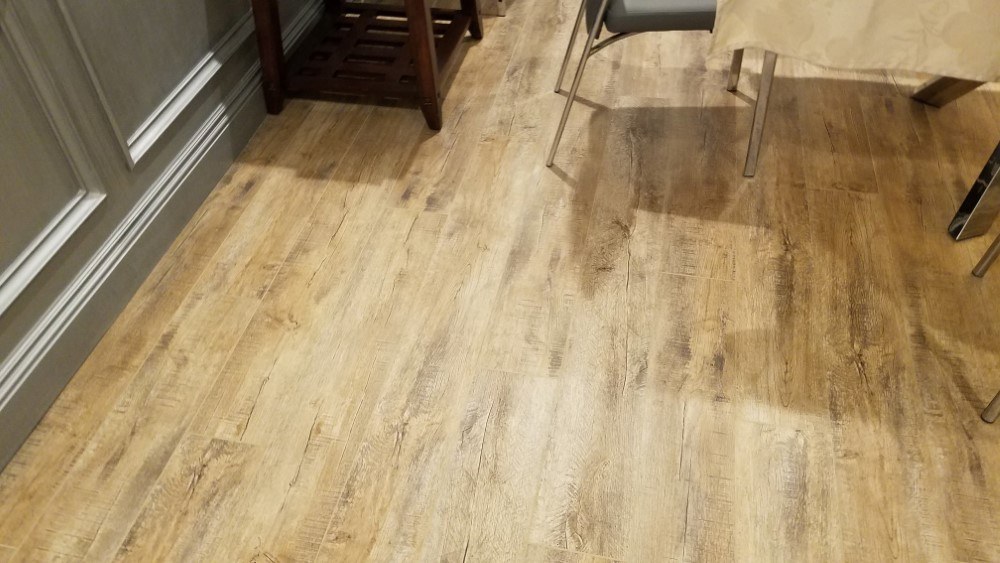 Customer was remodeling the entire basement level into an upscale entertainment living space. We remove the old carpet and floor coverings and then self- leveled concrete sub-floors and installed new Coretec Waterproof Luxury Vinyl Wood Look Planking in the basement areas including poker room, family room - entertainment , exercise room – gym and wine cellar.