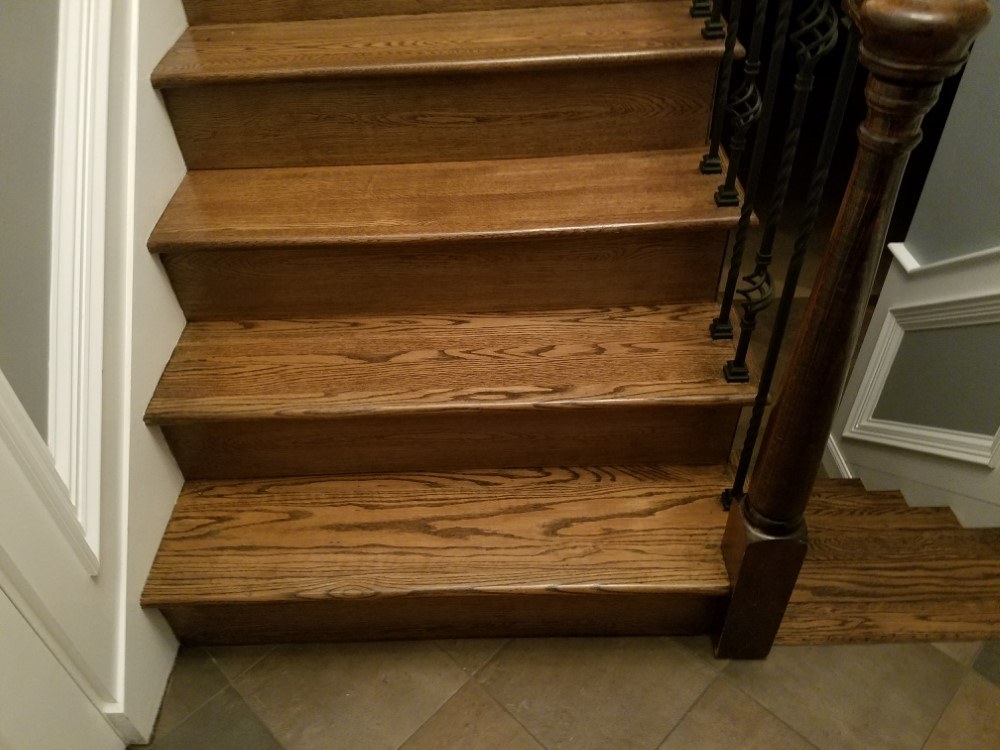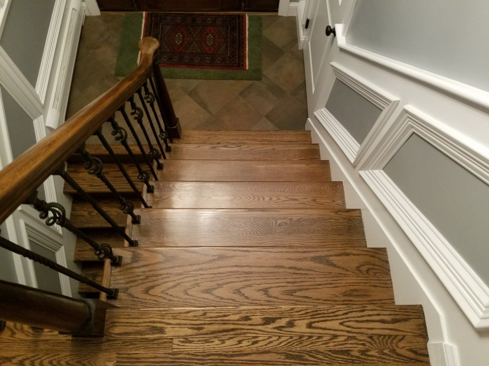 Customer wanted to remove old and dated carpeting in the living room, dining room, hallway and bedrooms of their bi-level home. They also wanted the carpeting removed from the stairs and wanted to give it the entry way an elegant and updated look to go along with the gray painted walls and white wood work and white base board molding.